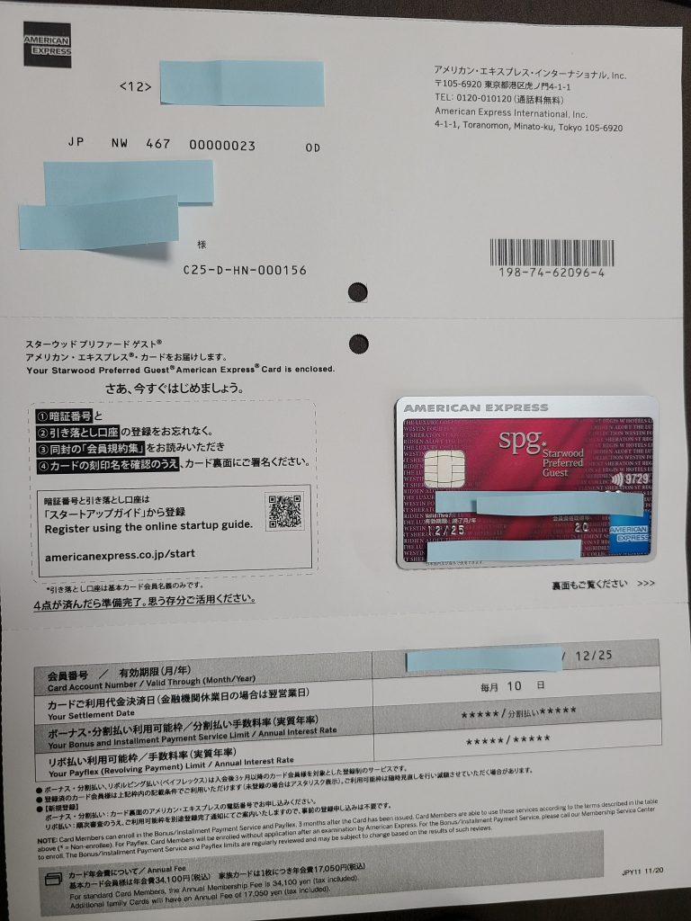SPG AMEX エスピージー アメックスのクレジットカードが届きました。